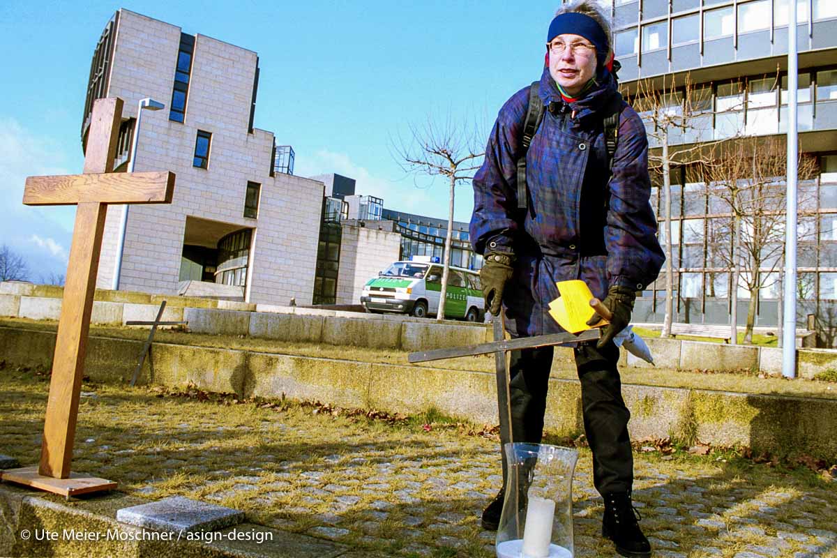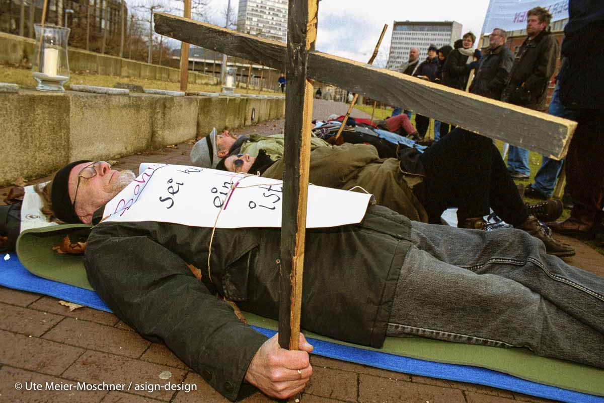 Düsseldorf, 21.1.2000: Mit einer Mahn- und Gedenkwache in Form eines – Menschenteppichs – und unter dem Motto „Deutsche Asylpolitik geht uber Leichen“ machen Pfarrer und Pfarrerinnen und Gemeindemitglieder vor dem Düsseldorfer Landtag auf die ungeklärte Situation der Flüchtlinge im Wanderkirchenasyl aufmerksam. Vor genau zwei Jahren begannen die nunmehr über 450 kurdische Flüchtlinge die Aktion des sogenannten Wanderkirchenasyls, um vor ihrer Abschiebung Zuflucht in Kirchengemeinden zu finden.
