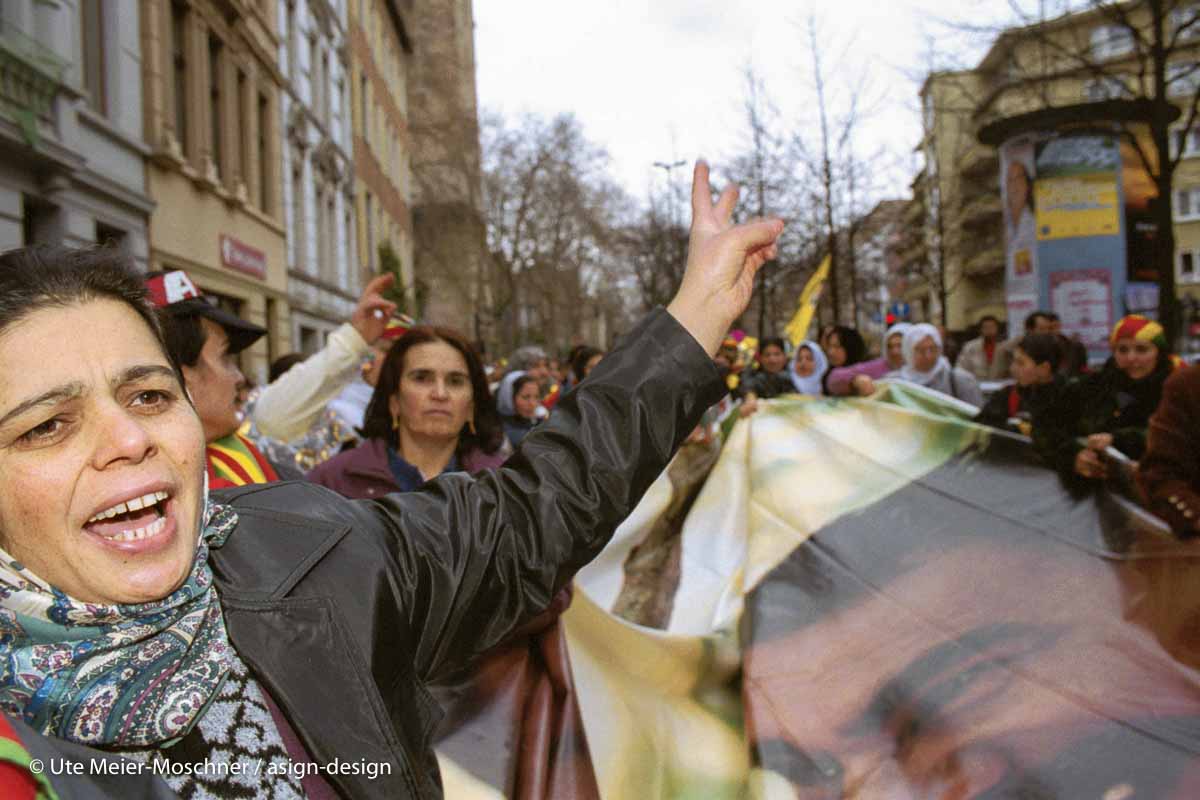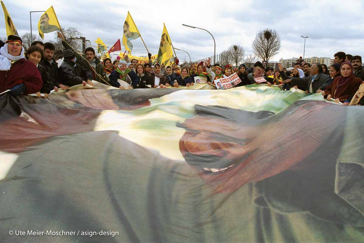 Köln, 4.12.1999: Demonstration von Kurdinnen und Kurden mit über 10.000 TeilnehmerInnen für die Freilassung von Abdullah Öcalan und Stop der Panzerlieferungen in die Türkei. „Am 29. Juni 1999 wurde Öcalan vor dem Staatssicherheitsgericht Ankara wegen Hochverrats zum Tode verurteilt. Das Urteil wurde unter anderem auf europäischen Druck hin nicht vollstreckt und 2002 mit der Abschaffung der Todesstrafe in lebenslange Haft umgewandelt. “ (siehe Wikipedia)